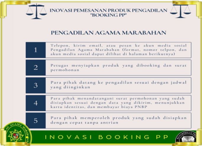 Booking PP adalah inovasi Pengadilan Agama Marabahan berupa layanan pemesanan produk pengadilan. Dengan adanya inovasi Booking PP, diharapkan urusan para pihak dapat lebih cepat selesai sehingga tidak perlu terlalu lama berada di pengadilan sehingga tumpukan antrian dapat dicegah.