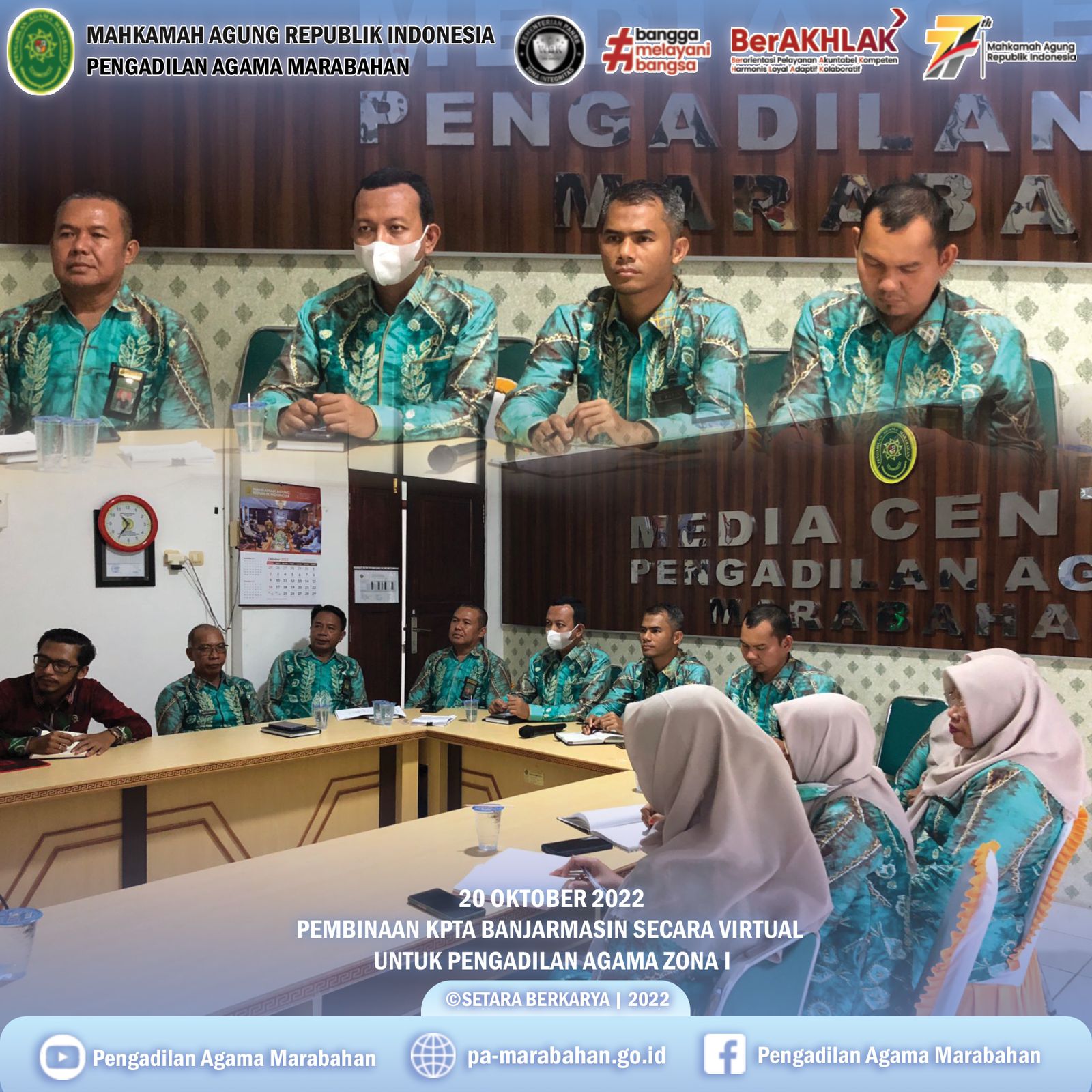 Marabahan- PA Marabahan hadiri pembinaan dan koordinasi Wilayah I (Zona I) oleh Pengadilan Tinggi Agama Banjarmasin secara daring (20/14). Selain PA Marabahan kegiatab tersebut juga diikuti oleh seluruh pengadilan agama zona I yaitu, PA Banjarmasin, PA Martapura, PA Kotabaru, PA Batulicin, dan PA Banjarbaru.