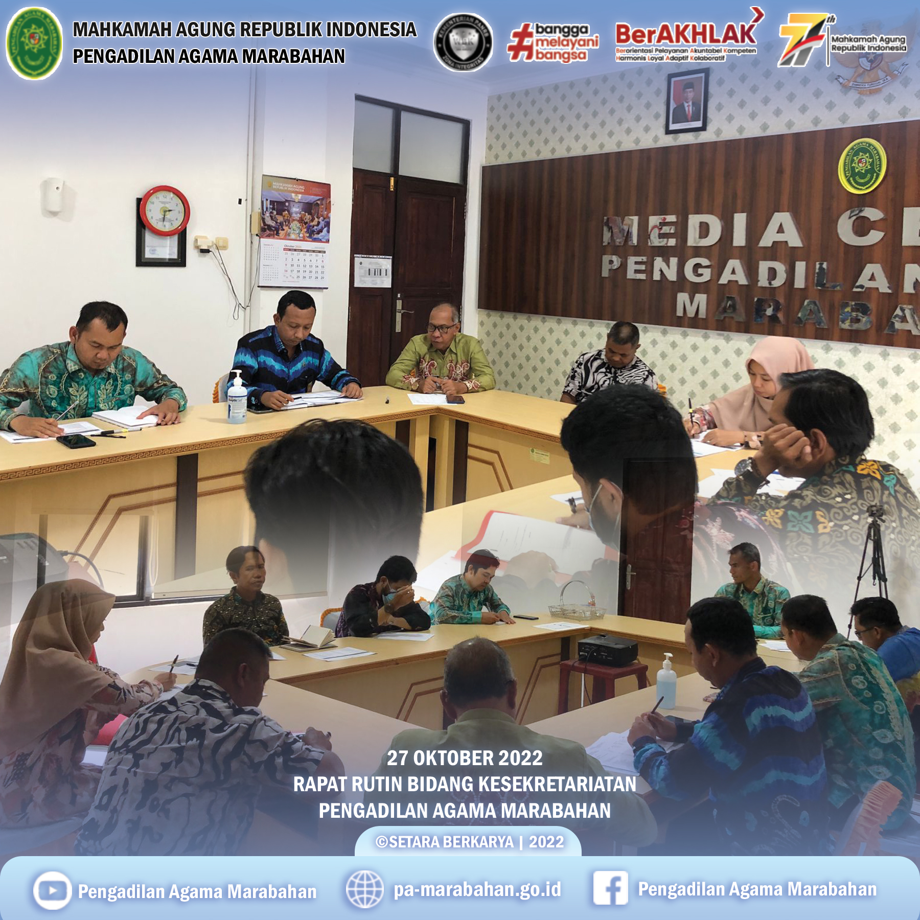 Rapat pada kali ini membahas mengenai Monitoring dan Evaluasi bulanan bidang Kesekretariatan pada bulan Oktober 2022. Agenda rapat dibuka oleh Sekretaris PA Marabahan Bapak Kasypul Anwar, S.H., dan di pimpin oleh Ketua PA Marabahan YM Bapak H. Dede Andi, S.H.I., M.H serta didampingi Wakil Ketua YM Bapak Fattahurridlo Al Ghany, S.H.I., M.S.I beserta para Hakim PA Marabahan, dan dihadiri oleh Pejabat Fungsional, Pejabat Struktural, Kasubbag Umum dan Keuangan, serta staf kesekretariatan dan PPNPN.