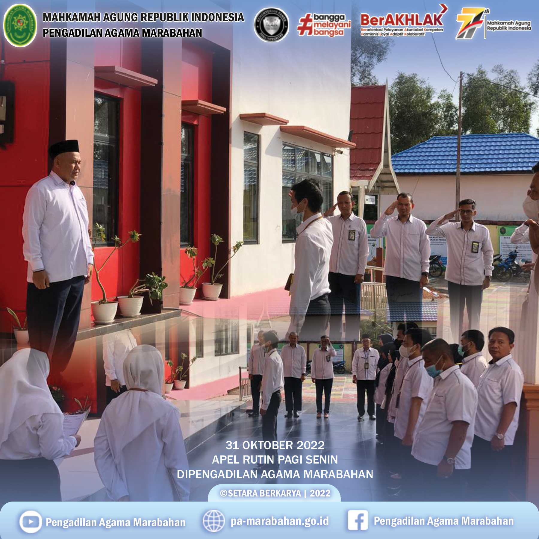 Senin (31/10/2022) Pengadilan Agama Marabahan melaksanakan apel pagi di halaman kantor Pengadilan Agama Marabahan. Apel diikuti oleh pimpinan, para hakim, pejabat struktural, pejabat fungsional, serta para staf. Dipimpin oleh Muhammad Zayadi, S.H., apel berlangsung khidmad, tertib dan lancar. Panitera Pengadilan Agama Marabahan, bapak H. Samsuri Yusuf, S.H. yang bertindak sebagai pembina apel menyampaikan bahwa hendaknya para pegawai terus meningkatkan kedisiplinan, profesionalisme, serta semangat kerja.
