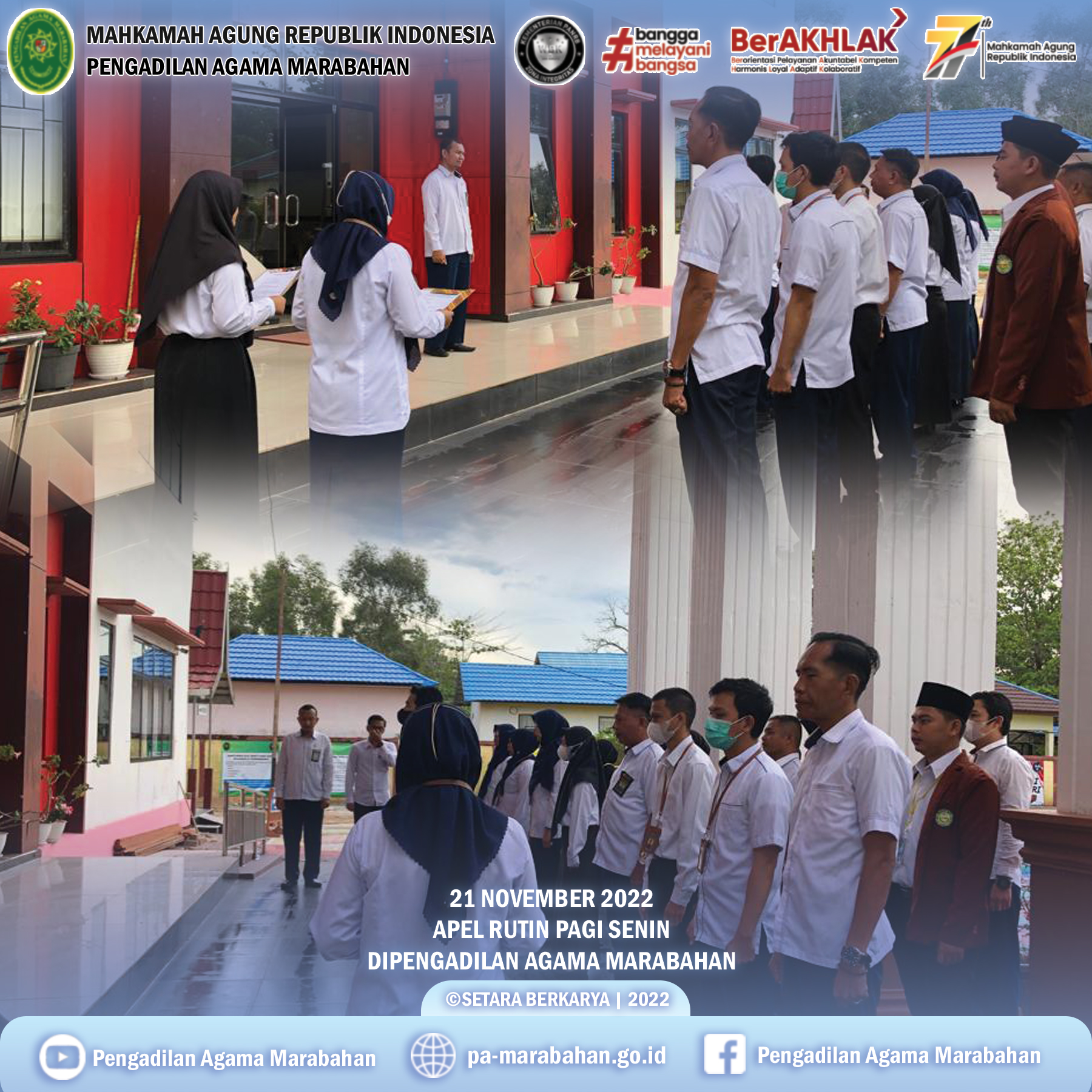 Senin pagi hari (21/11) seluruh pegawai Pengadilan Agama Marabahan sangat antusias dalam melaksanakan kegiatan rutin apel sore yang dilaksanakan di halaman Pengadilan Agama Marabahan.